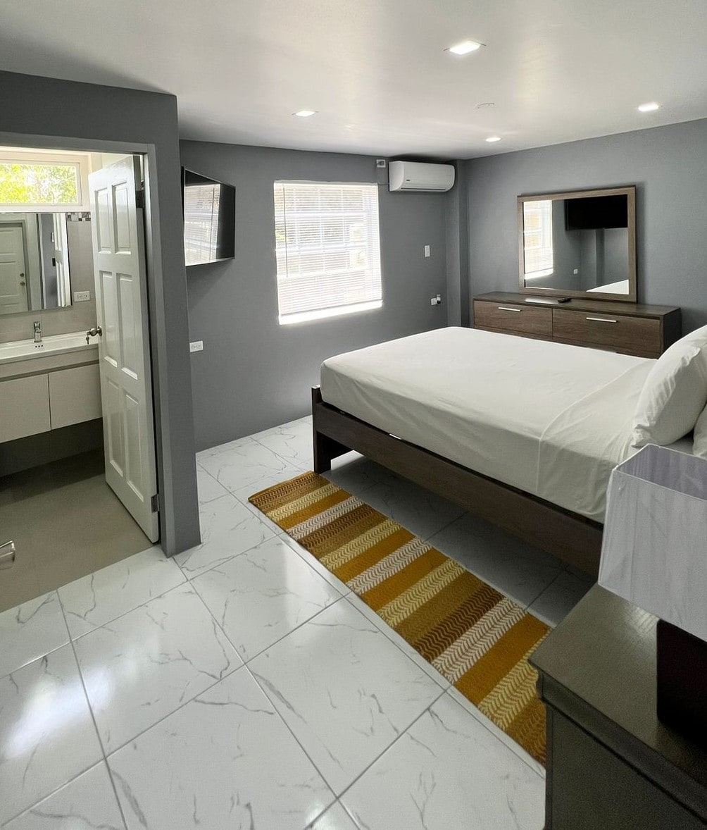 Apartmen studio yang dilantik sepenuhnya yang terletak di taman tropika yang subur dengan pokok buah-buahan, bunga dan herba. Reka bentuk seni bina semula jadi Caribbean moden dengan kabinet cedar tempatan dan permukaan kaunter Samaan ditindih di atas lantai konkrit yang digilap. Pintu gelangsar besar membuka seluruh apartmen sehingga ke luar. Karpet rumput untuk berjemur atau melihat bintang-bintang. Ruang makan al fresco untuk menikmati malam Caribbean yang sejuk.