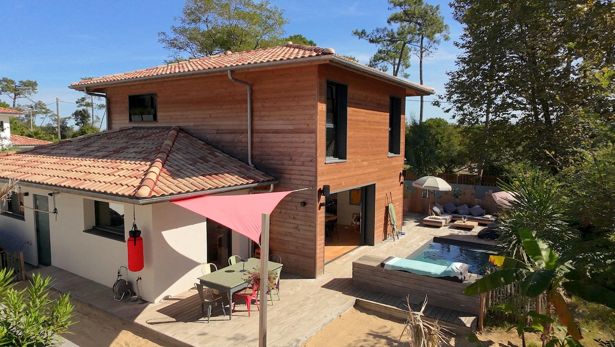 Percutian alam semula jadi antara laut dan hutan – Syurga kedamaian di Landes Manjakan diri anda dengan rehat yang tenang di rumah kayu besar ini, bermandikan cahaya. Terletak hanya 200m dari pantai dan 300m dari hutan, ia membolehkan anda menikmati alam semula jadi sepenuhnya, antara berjalan kaki di laluan basikal dan berehat di tengah-tengah taman eksotik yang subur. Tidak jauh dari Basque Country, rumah ini sesuai untuk keluarga dan kumpulan yang mencari konvokesyen dan ruang terbuka yang luas.