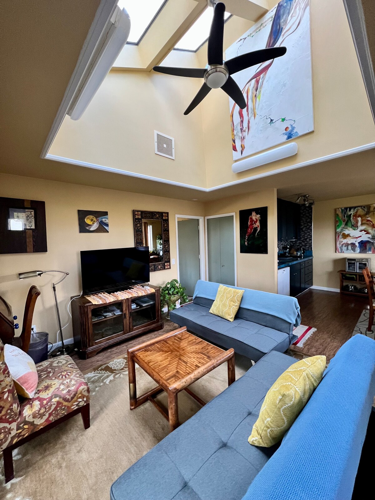 California surf style at its most comfy! Colorful, comfortable, and stylish, it's like a time warp but with modern amenities. Enjoy a cup of coffee on the shaded porch, or gather around the outdoor fire pit and chill out while you groove to the specially curated 60s surf Spotify playlist after a day at the beach. It's the perfect size for a small family or two couples. Such seriously good vibes you'll want to stay forever and call it home. Hassle-free check-out. (STR20-063)