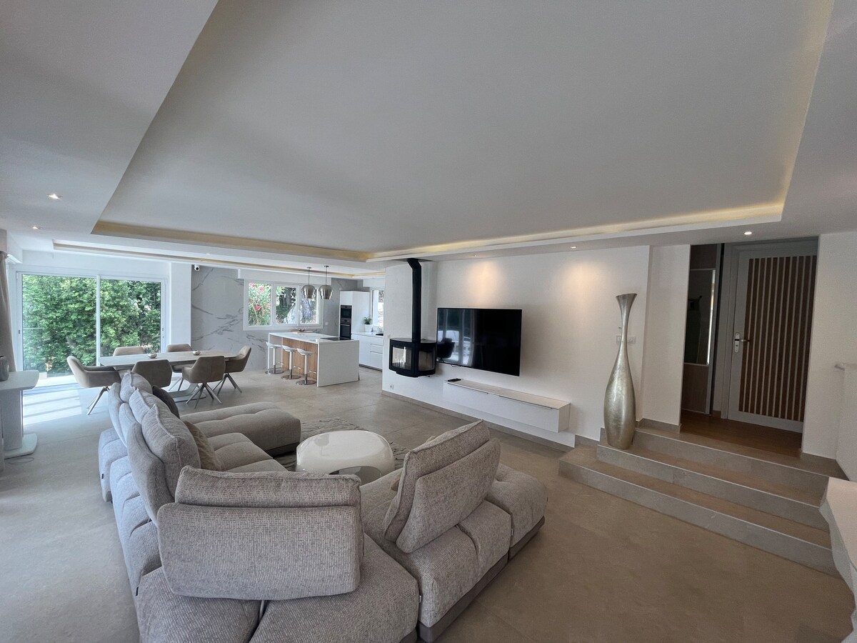 2025 berita rumah kami didaftarkan secara rasmi sebagai rumah 4 bintang Bersantai di penginapan unik dan tenang ini dengan pemandangan laut dan gunung panorama. Vila ini terletak di ketinggian Antibes di kawasan perumahan yang tenang dikelilingi dengan plot seluas 5800 m2. semua kedai adalah 3 minit dengan kereta dan pusat bandar dan pantai adalah 7 minit jauhnya.
