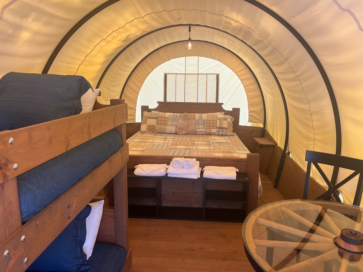 In the shade of the oaks, convenient to all of the resort amenities, Wildflower Wagon offers historic charm and modern comfort. Step into the climate controlled, spacious interior with an Amish-made wagon-wheel table, comfy beds (1 king and a set of bunks), as well as hooks and shelves for storage. Enjoy your outdoor living space complete with picnic table, Adirondacks and a firepit perfect for grilling up burgers or roasting s'mores. Clean bathrooms with hot showers are a few steps away.