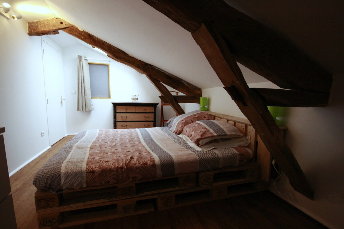 Kami gembira untuk mengalu-alukan anda ke Atypical PureColor, 70m2 dengan pesona rasuk yang terdedah. Dengan teres. Kain mandi dan cadar disediakan. Untuk keselesaan anda, katil akan disediakan untuk ketibaan yang tenang. Tenang, seperti di kawasan desa, tetapi dengan semua kemudahan pusat bandar sejauh 1 minit berjalan kaki. L'Atypique mengalu-alukan anda dengan semua peralatan yang diperlukan untuk penginapan yang tenang bersama keluarga, rakan atau rakan sekerja.