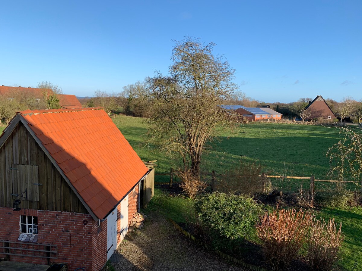 Apartmen percutian ini terletak di tingkat atas sebuah ladang rehat berusia kira-kira 100 tahun hanya 3 kilometer dari Sehlendorfer Strand yang indah. Apartmen kira-kira 90 m² dengan pintu masuk berasingan baru sahaja diubahsuai dengan penuh kasih sayang dan kini tersedia untuk tetamu kami. Di luar terdapat teres persendirian dan kawasan barbeku, tempat letak kereta persendirian, bangsal basikal, banyak alam semula jadi dengan ayam, anjing, lembu di tepi pagar jiran dan kolam kecil.