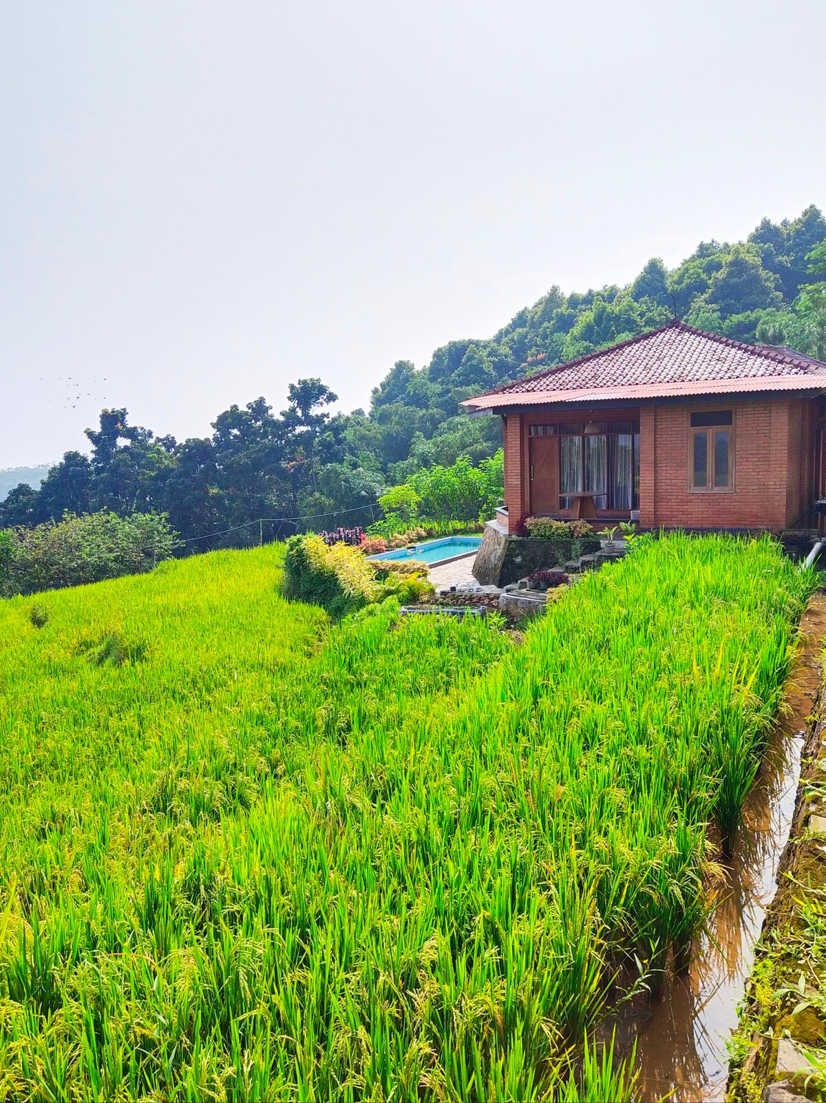 Vila terdedah bata bilik tidur yang selesa, dikelilingi sawah yang boleh memberikan tempat persembunyian yang santai & menyeronokkan dengan udara segar dan persekitaran yang tenang