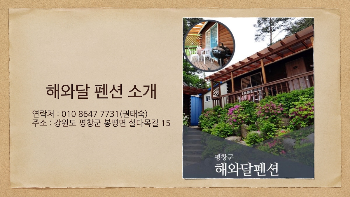 Ia adalah rumah tumpangan penyembuhan persendirian yang terletak 680 meter di atas paras laut di Pyeongchang, dengan pemandangan indah dan cahaya matahari yang hangat sepanjang hari dengan Jeongnam-hyang.