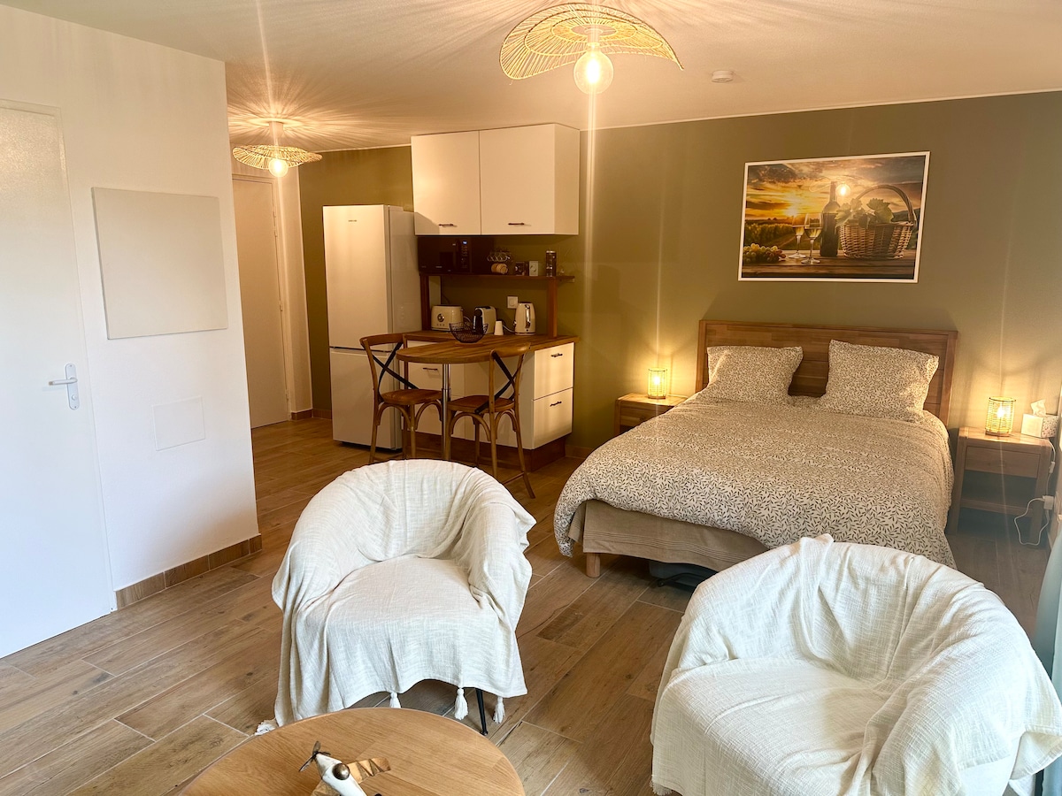 Terokai dunia ajaib "La Source de Genes". Terletak di ketinggian lereng bukit Saint Genès de Castillon, anda akan merenung matahari terbenam yang indah di menara loceng Saint Emilion (8 minit memandu) dan ladang anggur milenialnya. Bekas burung burung pheasant baru-baru ini dipulihkan, anda akan mempunyai teres 40 m2 dengan pemandangan yang menakjubkan, ruang tamu yang sangat besar seluas 45m2 (sofa + katil bujang) dan bilik yang luas 14m2 (katil double 160 cm).