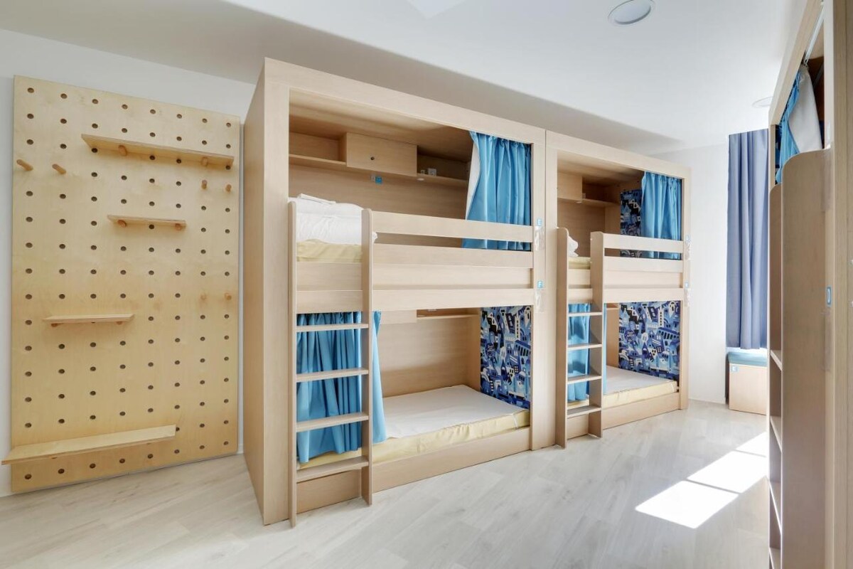 En famille, entre amis ou seul(e), choisissez nos chambres de 8 avec salle de bain privée. Vous y trouverez nos lits « capsule », designs et confortables en bois massif, 100% sur mesure et fabriqués en France. Chaque lit dispose d’une liseuse, une prise électrique et USB, un casier sécurisé, un miroir et un rideau opaque pour une parfaite intimité. Des serviettes sont à louer à la reception.
