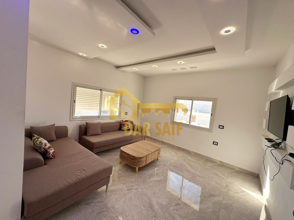 Située à 300 m de la mer,ce qui offre un accès facile à la plage et une vue magnifique. Elle dispose de deux pièces ce qui la rend idéale pour une petite famille ou un couple. -Piscine privée de 15 m sur 5 m avec jacuzzi pour vous détendre et vous rafraîchir pendant les journées ensoleillées. -Terrain de foot est un excellent ajout pour les amateurs de sport et les enfants qui aiment jouer au football. - Jardin ajoute une touche de verdure et offre un espace pour se détendre en plein air.