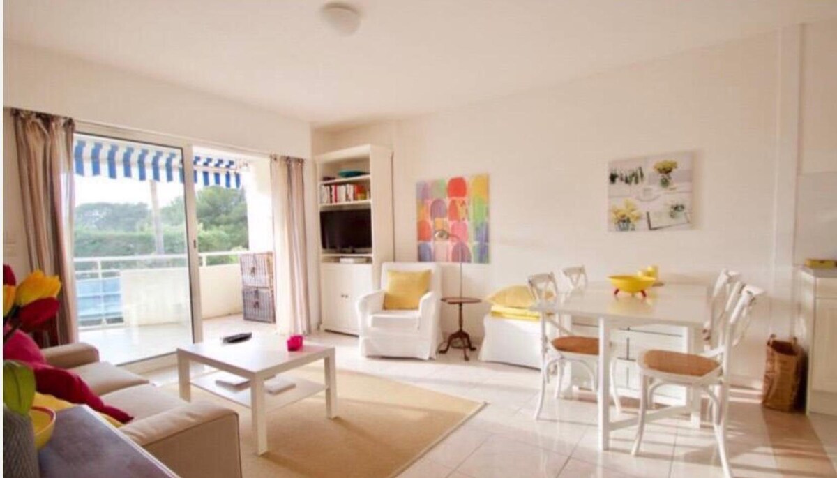 Di tingkat tiga dan atas (lif) kediaman mewah, apartmen 40m2 ini berhawa dingin, tenang dalam suasana hijau 200m dari pantai, restoran dan kedai. Teresnya yang besar dengan pemandangan laut, tanpa sebarang pemandangan, menjemput anda untuk berehat di sana sepanjang hari. Anda boleh bersarapan, berjemur dan pada waktu petang, merenung matahari terbenam yang indah. Bilik persendirian dan selamat tersedia untuk basikal anda.