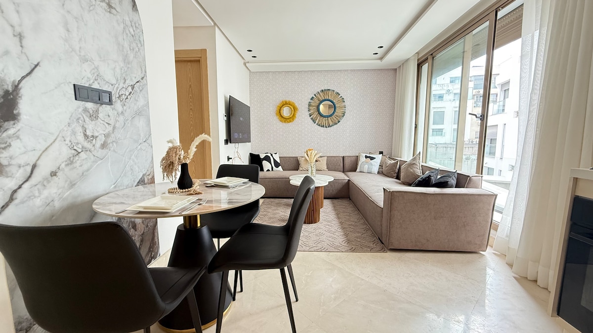 modern luxury studio with a cozy double bed, fully equipped kitchen, bright living area, bathroom, and access to an outdoor pool. Perfect for business or leisure. ✨ Returning travelers gift: free 15-min massage in a private VIP lounge at Casablanca or marrakech airport , with Moroccan tea/coffee & pastries. ⭐ Key Features: 🛏 Luxury studio 📍 5 min from airport 🏊 Pool access 🍽 Kitchen ☀ Bright space 🔐 Secure & quiet 📶 FAST Wi-Fi & 55 pouce Smart TV & netflix 🚗 Parking