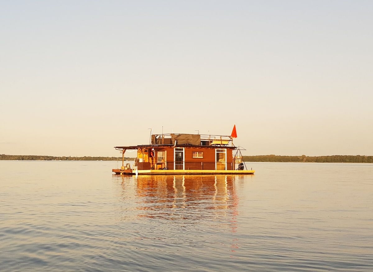 Rumah bot kami adalah bot kekal yang selesa dan moden, yang terletak di jeti tapak perkhemahan. Peralatan berkualiti tinggi dan pemandangan indah di atas Tasik Templin menyukarkan kami untuk keluar setiap kali. Pada musim panas, kami menikmati teres bumbung seluas 90 meter persegi, yang juga menjemput anda untuk barbeku. Melalui pemanasan bawah lantai, pendiangan dan sauna persendirian, kami juga menjadikan rumah bot kami tempat percutian yang hebat pada musim sejuk.