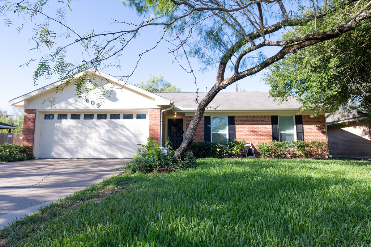 We think of everything so you don't have to. Our Southern hospitality & stocked home makes it feel like it's YOUR home away from home. It's a remodeled 1955 home with original hardwood floors, a large fenced backyard, a shaded patio with string lights, & high-speed Wi-Fi. Enjoy the home's amenities in a quiet, developed neighborhood, all while being 2 miles from A&M & the best food and excitement. We're locals, so it's a priority that guests feel the 5-star care in the details & experience.