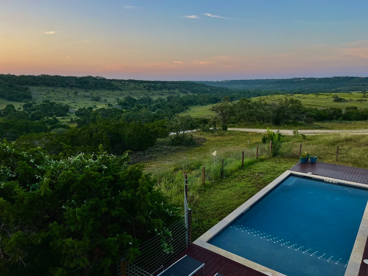 Private natural oasis with 3 cabins, private pool, cedar hot tub, and private observation deck. The private 8-acre property is located in the heart of hill country, with amazing panoramic views. Newly remodeled with thoughtful design and furnishings. Fully solar power with grid and battery backup. *ALL 3 cabins are included in the price* NOTE: The drive ends with a 1-mile gravel road. These are common in hill country and cars of all sizes are fine... just drive slowly (10 mph)