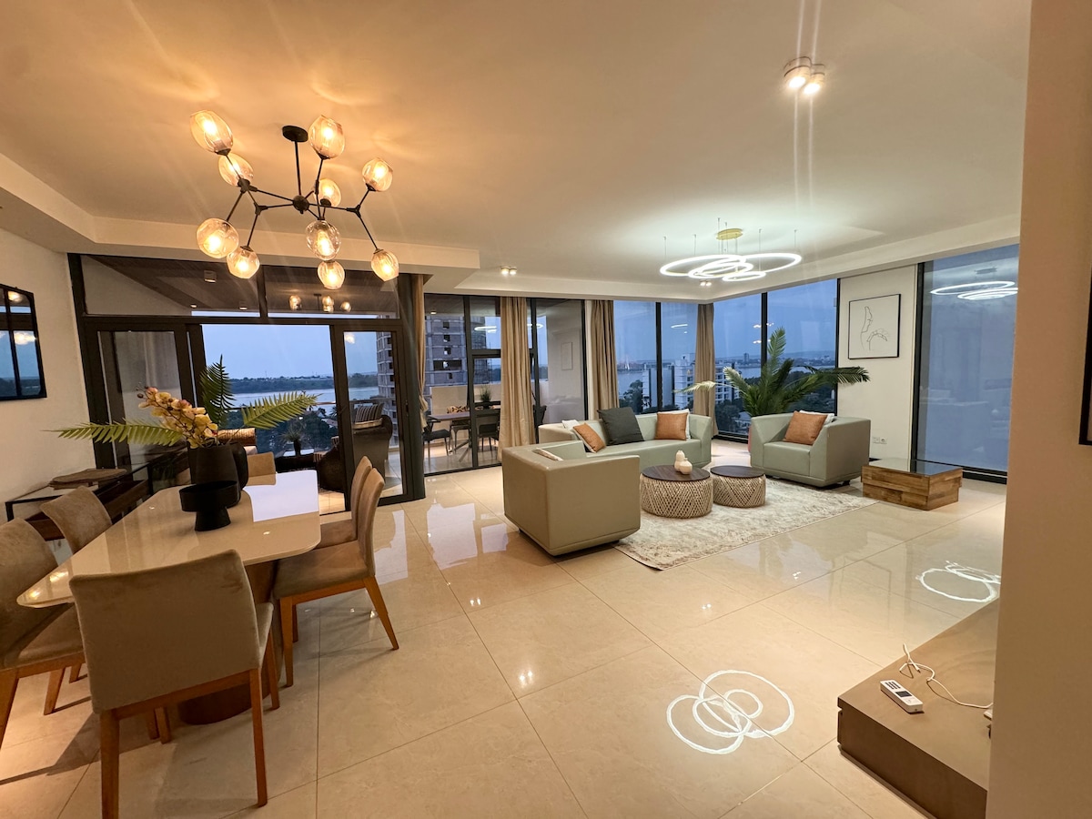 Nikmati kemewahan yang tiada tandingan di apartmen 3 bilik tidur yang indah ini dengan pemandangan panorama Sungai Congo yang paling menakjubkan. Menampilkan kemasan mewah & katil berkualiti hotel yang dihiasi dengan cadar kapas. Terletak di daerah Gombe yang berprestij, dalam jarak berjalan kaki (600m) ke Galerie la Fontaine Mall/hotel Pullman. Manfaatkan kolam renang atas bumbung, gimnasium dan restoran gourmet, dan bar lounge yang bergaya. Terokai lambang kehidupan mewah yang sesuai untuk berehat atau hiburan