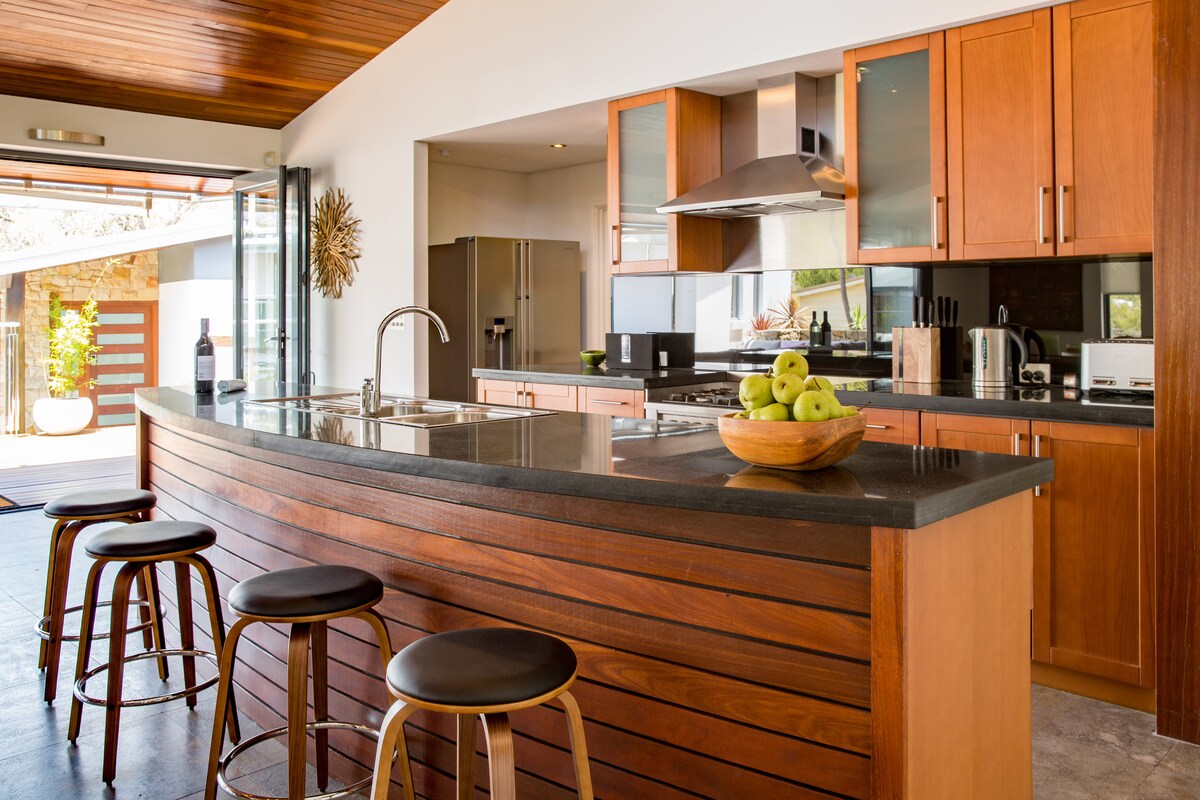 Selamat datang ke Bayside Palms, rumah cantik yang menggabungkan getaran Palm Springs dengan tarikan pantai. Kawasan luaran menampilkan dek yang luas dengan pemandangan halaman berumput yang separa teduh, lengkap dengan tab mandi air panas, BBQ, meja makan, kerusi rehat, trampolin dan pancuran mandi luar - sesuai untuk hari pantai. Di dalamnya, anda akan menemui permainan, PS3, & DVD untuk malam yang selesa di tepi perapian kayu. Orang dewasa juga dapat menikmati gimnasium rumah! Bagi peminat memasak, masak hidangan di dapur kami yang serba lengkap.