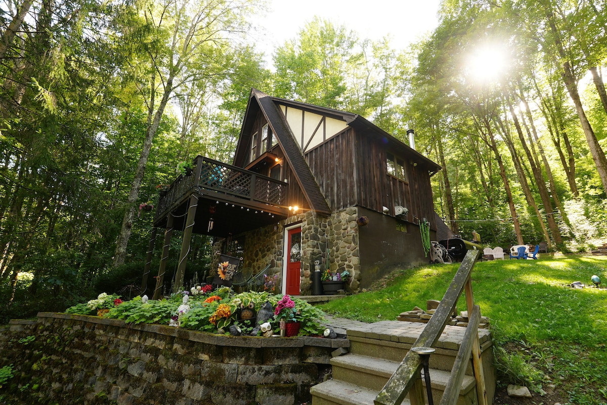 Percutian, percutian terpencil tetapi berhampiran bandar. Kabin yang selesa ini adalah desa dengan beberapa gaya yang bergaya, hiasan & kemas kini terkini. Terletak di atas 2 ekar hutan & berhampiran bandar. 2 pendiangan batu, tab Jakuzi dalaman, 2 1/2 BA, 3-4 BR & 7 orang tab mandi air panas luaran. WIFI, dapur & makan yang sangat baik. Berkelah, pemanggang & perapian. Dedaunan musim luruh yang hebat, berhampiran ski, berhampiran hiking, pelancaran bot. Dilengkapi sepenuhnya, hanya bawa diri anda!! Bersedia untuk menerima tetamu-ask!!