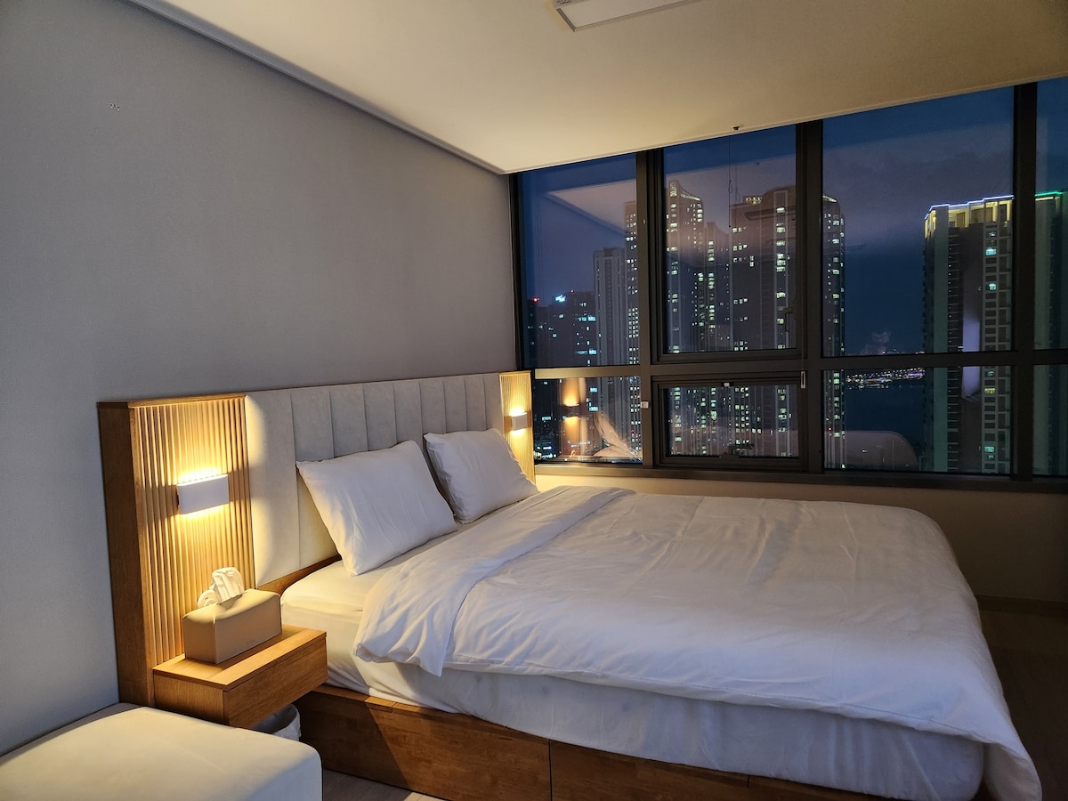 Sunstay 💘 ● Stunning ocean & sunset view ● A new building built in 2024 ● Big cafe table ● Beam projector ● 50-inch Google Smart TV ● SK Broadband Btv ● Free Netflix, Youtube Premium (host account) ● Electric kettle, toaster ● Various drinking glasses (sake/beer/soju/wine/champagne) and kitchen utensils ● Washing machine, heat drying rack ● Make-up table, straight/curling iron ● English chat, phone call ok ● Immigration support (confirmation letter of accommodation, rental contract) available