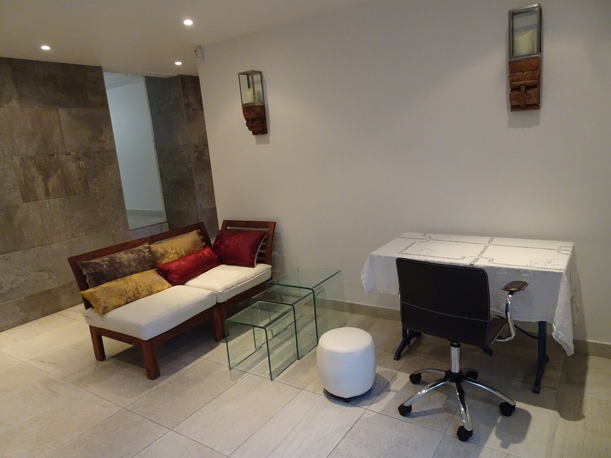 30 minit dari TourEffeil, berehat sejenak di studio 34m² yang indah ini di tingkat bawah yang telah diubah suai sepenuhnya. Ia terdiri daripada: - Parkir percuma - Perhentian bas 2 minit berjalan kaki - Semua kemudahan berhampiran (Restoran, Pasaraya, Pusat membeli-belah dll) - Kawasan bermain di dalam kediaman kanak-kanak - Ruang tamu besar dengan 1 katil + 1 katil sofa yang boleh memuatkan 2 orang - Dapur yang dilengkapi dengan keperluan - Bilik mandi (tuala, gel mandi)