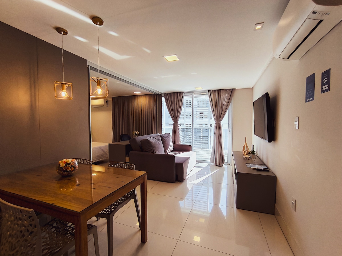 Apartamento aconchegante e bem decorado, ar condicionado e TV no quarto e sala. Cozinha completa para preparar refeições apreciando uma linda vista. Sala com sofá confortável e uma rede para descansar, roupas de cama e banho disponíveis. Wi- fi de alta velocidade. Piscina interditada às segundas.