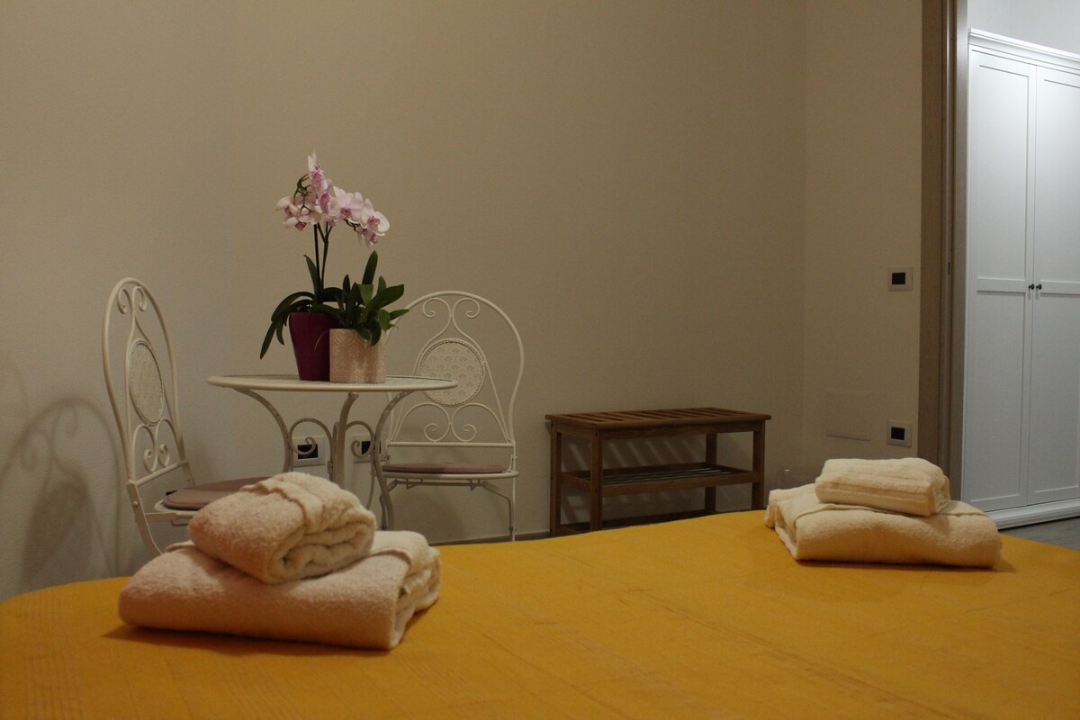 La camera, spaziosa e luminosa, è fornita di letto matrimoniale con possibilità di un letto singolo aggiuntivo, previa richiesta, climatizzatore e TV. La camera si affaccia in un privato e ampio terrazzo ben arredato dove potersi rilassare, prender il sole o sorseggiare un buon caffè. Il bagno privato è situato al pian terreno.