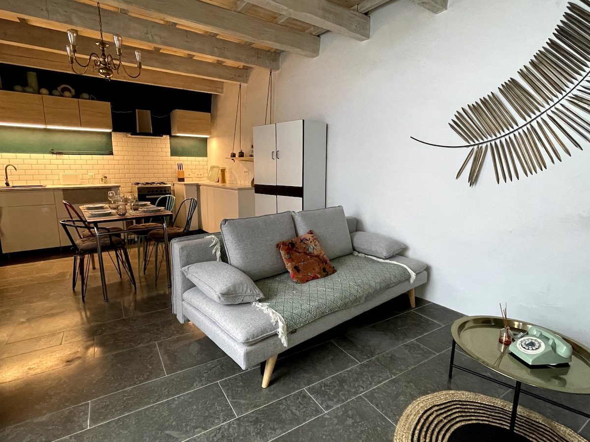 Di tengah-tengah kampung lama, anda akan berasa tidur dengan tenang di pondok yang terletak! Penginapan ini terletak di bahagian bawah patio dalaman kami. Anda boleh menikmati perhentian yang sejuk ini di taman kecil yang subur ini. Di DRC, dapur ruang tamu mempunyai segala yang anda perlukan untuk berehat. Anda akan menemui dapur kecil untuk makanan anda (peti sejuk, ketuhar gelombang mikro, kompor elektrik, pembuat kopi, pinggan mangkuk...) dalam suasana bohemia dan vintaj yang bergaya.