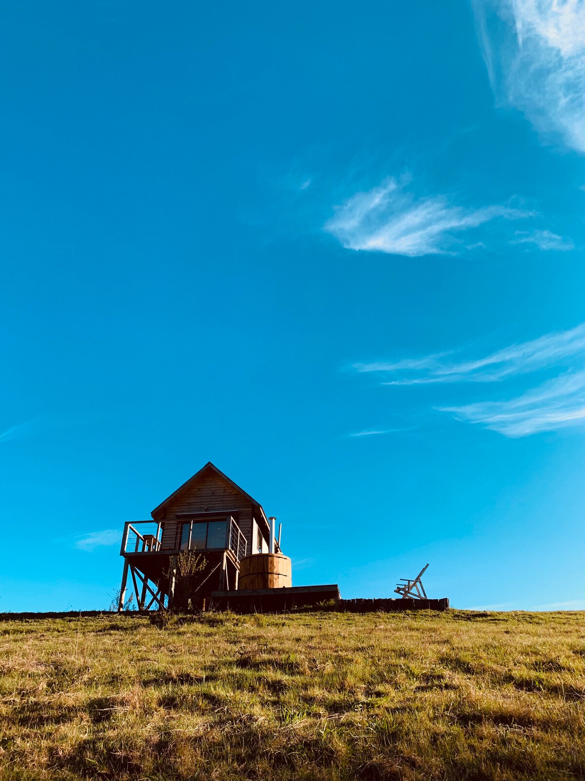 Duplex for 2. 7 mts above ground. 2 acre private park. Decks with panoramic views to infinity and a hanging bridge to let your dreams fly. Thermal insulation, double glass windows, floor heating and slow combustion fireplace. Queen size bed. Desk, Wi-Fi, full kitchen with fridge, induction top and all the necessary utensils to enjoy the stay. Full bath with a shower with amazing view, towels, hair dryer, bidet!, fire pit, bbq and parking. 6 kms from Pucón on paved road. Ran by its owners.