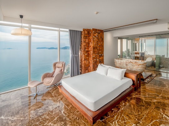 Apartmen berperabot lengkap yang luas ini mewah pada standard 5 bintang di tingkat tinggi, dengan bilik tidur& bilik mandi berasingan ( tab mandi & pancuran mandi, skala bilik mandi, air panas), dapur & ruang makan, ruang tamu peribadi dengan set sofa dan meja besar, TV 50"(> 60 saluran), wifi, peti sejuk besar, mesin basuh, 3 penghawa dingin di bilik tidur, ruang tamu dan dapur. Balkoni besar ( dengan meja & kerusi) menghadap laut, ia menawarkan pemandangan pantai & Pulau Vinpearl di luar laut.