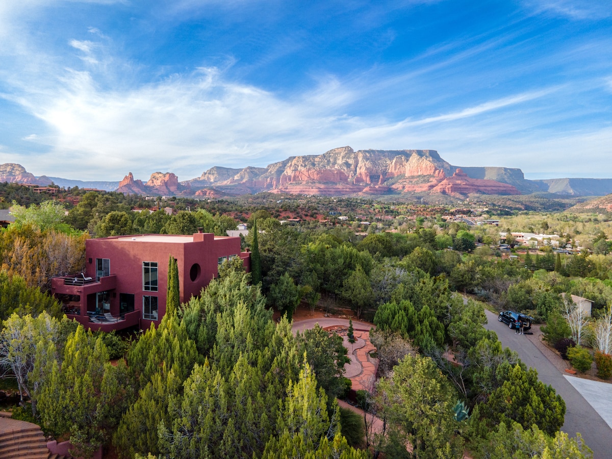 Enjoy majestic views of famous Sedona Red Rocks in the luxury of your own private villa. Steps away from iconic Chapel of the Holy Cross, popular hiking trails. House features mid-century modern aesthetic, 1- KING size , 1 -Sofa bed with 2 baths, 2 spacious living rooms, kitchen, office, outdoor dining space w BBQ. After a day in the desert, just short distance away, head to Downtown Sedona, pursue incredible art galleries and explore local restaurants ! TPT# 21426328/ 1,800 Sq. Ft.