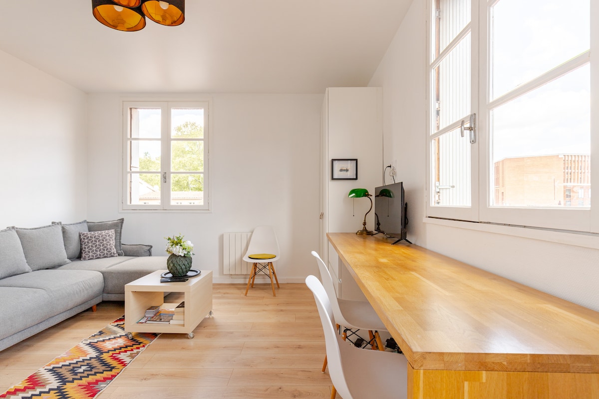 T3 yang menawan menyeberangi 70m² di bangunan kecil yang tenang dan selamat. Terletak di lokasi yang ideal, antara Garonne dan Canal du Midi, nikmati laluan hijau untuk sampai ke pusat bersejarah (10-15 minit berjalan kaki dari kapitol). Apartmen ini mempunyai semua keselesaan yang diperlukan (mesin basuh pinggan mangkuk, mesin basuh, dapur besar) dan ruang letak kereta yang selamat (termasuk). Penyaman udara mudah alih tersedia. Anda akan berasa selesa seperti di rumah sendiri di sini!
