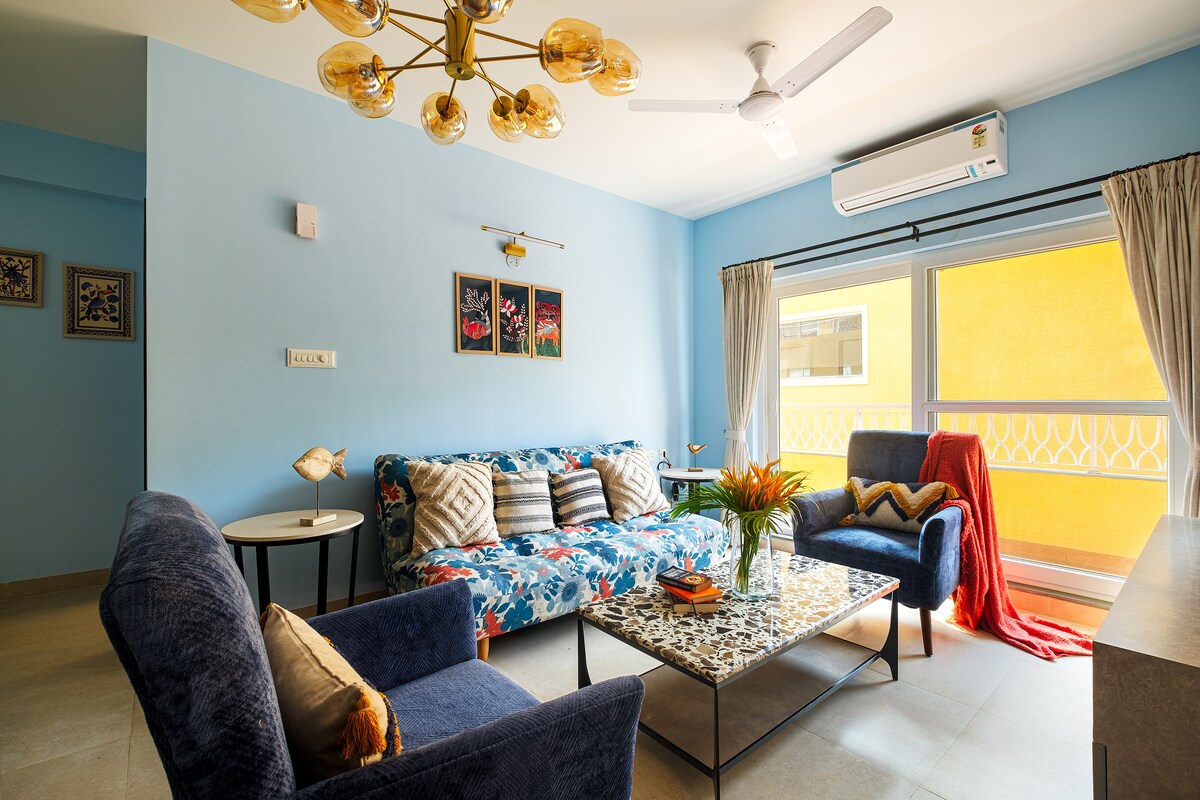 Flat 2 bilik tidur, 2 bilik mandi dan satu sofa kami yang luas dilengkapi dengan sentuhan keanggunan tropika yang bergaya dengan balkoni persendirian yang terbuka ke bukit yang tenang, taman & pemandangan kolam renang. Kemudahan yang Anda Akan Suka: #Hanya beberapa minit dari Pantai Candolim, kafe popular, pasar #Taman yang indah sesuai untuk kopi pagi atau berehat pada waktu petang #Kolam renang untuk menyejukkan diri selepas seharian di pantai yang cerah #Dapur serba lengkap #WiFi Berkelajuan tinggi & TV Pintar #Kompleks berpagar selamat dengan keselamatan 24/7 dan tempat letak kereta