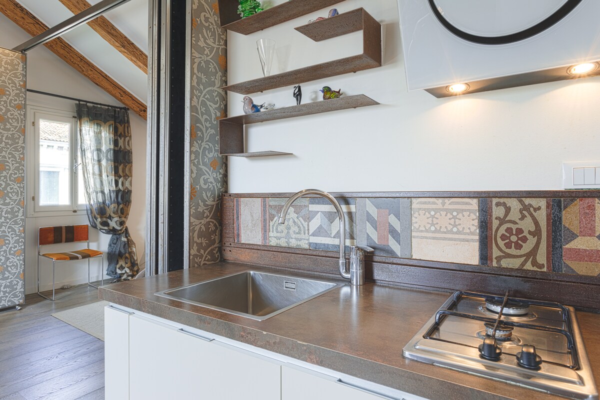 Apartmen ini terdiri daripada ruang tamu terbuka yang cerah dan lapang, bilik tidur, dapur dan bilik mandi dengan tab mandi. Tarikan utamanya adalah ruang yang cerah, pemandangan atas bumbung yang cantik, aman dan tenang. Ia adalah sebahagian daripada bangunan abad XVII beberapa langkah dari Grand Canal, berhampiran gereja Frari, Scuola Grande di San Rocco dan rumah Carlo Goldoni. Mudah untuk pergi dan bergerak dengan berjalan kaki atau dengan pengangkutan awam, ia terletak di daerah yang meriah yang penuh dengan restoran dan bar biasa.