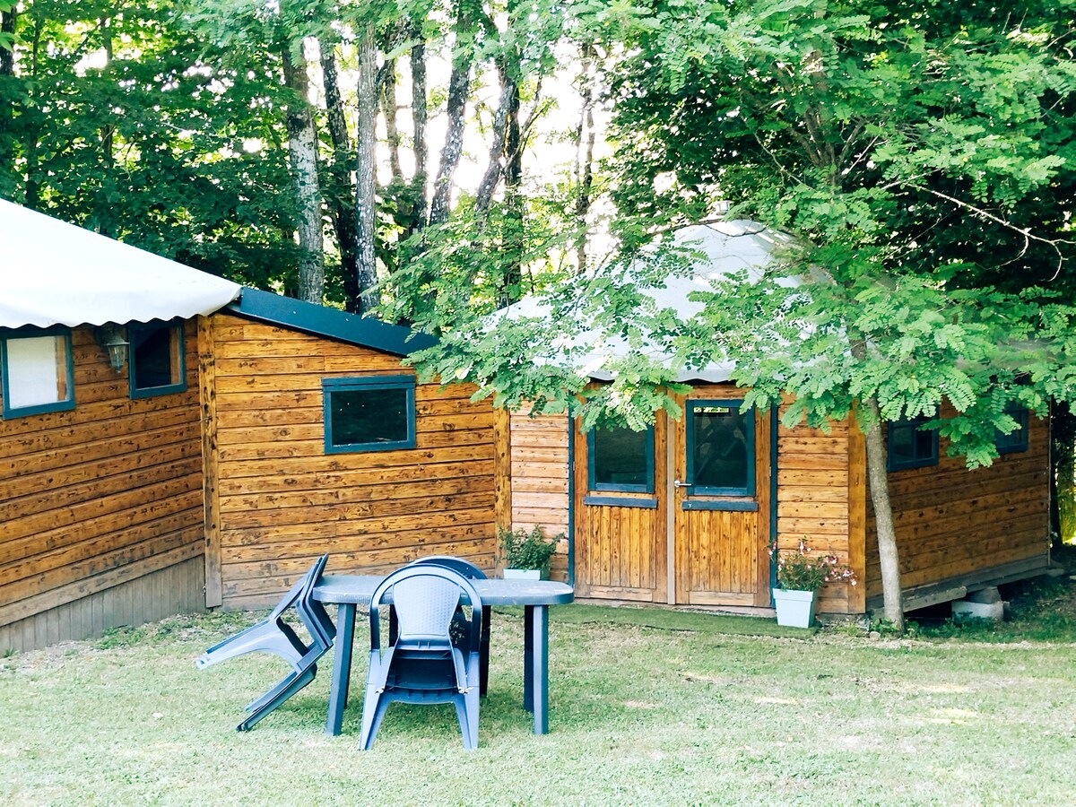 Kabin kayu seluas 9m² dan teres 15m² di atas panggung, terletak di tengah-tengah kayu kecil seluas 5000 m². Sesuai untuk pentas untuk penunggang basikal dan/atau pendaki. - Tandas kering dan pancuran di bawah saringan kayu - Katil tarik keluar dua tempat duduk - Barbeku dan teres tersedia Persekitaran yang tenang dan teduh. Kabin ini terletak 35m dari rumah pemilik di dusun berhampiran Aurillac (10km). Semua kedai di 3 km dan pangkalan nautika pada 7 km