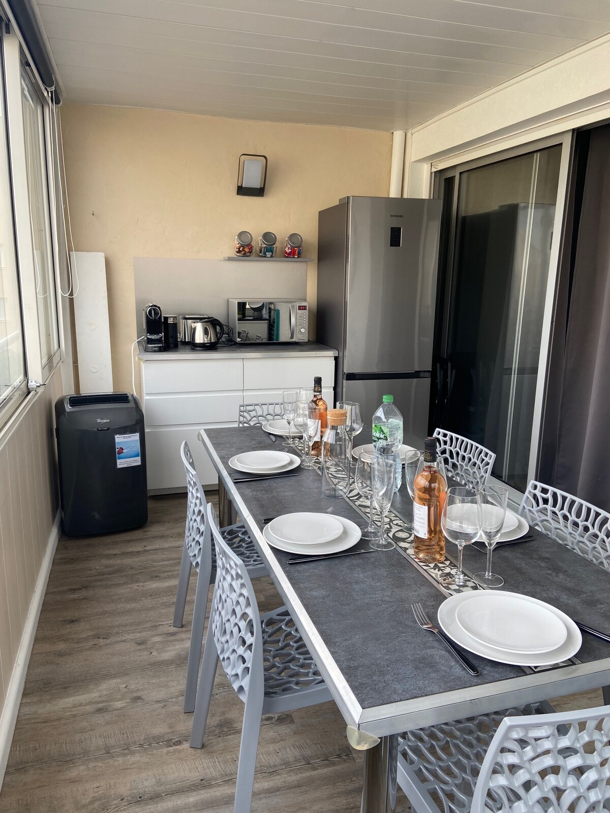 Apartment with terrace for five people (wifi, aircond...) overlooking the large swimming pool with sunbeds and paddling pool, parking in the condominium located by the sea.... Lokasi yang sangat baik, anda boleh melakukan segala-galanya tanpa kereta: pantai, kedai, pusat pelabuhan, restoran.. Anda mempunyai akses berjalan kaki dalam masa 4 minit ke pantai La Conque , plagette... Perhentian bas berada di kaki kediaman (stesen/kediaman Agde).