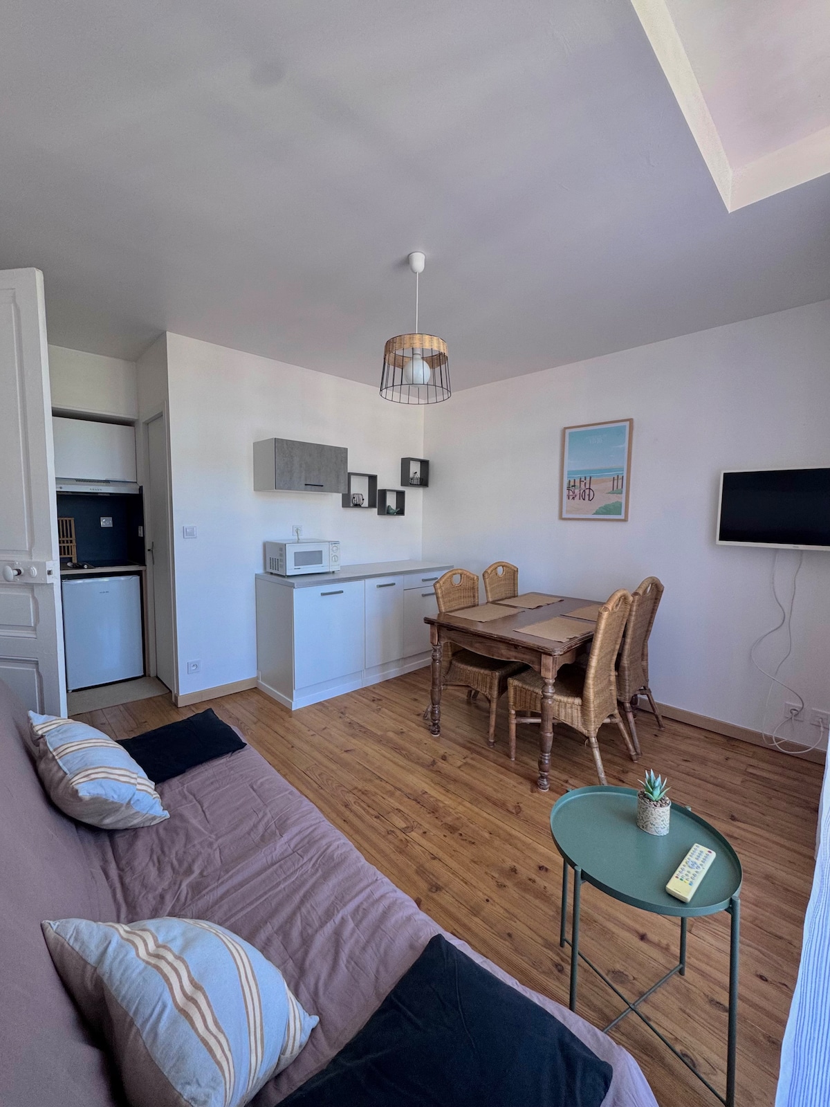 Studio yang selesa dan berfungsi, diubah suai sepenuhnya, dengan pemanas untuk penginapan walaupun pada musim sejuk. Ia mempunyai katil sofa untuk dua orang dan katil mezanin (kanak-kanak). Menghadap ke barat, apartmen ini mempunyai pemandangan ruang hijau dan, di kejauhan, bukit pasir. ⚠️ Mulai 7 September, kerja akan berlangsung di kediaman. Disebabkan oleh kemungkinan pencemaran bunyi dan ketidakupayaan untuk menggunakan balkoni, diskaun 25% dikenakan untuk tempoh kerja.