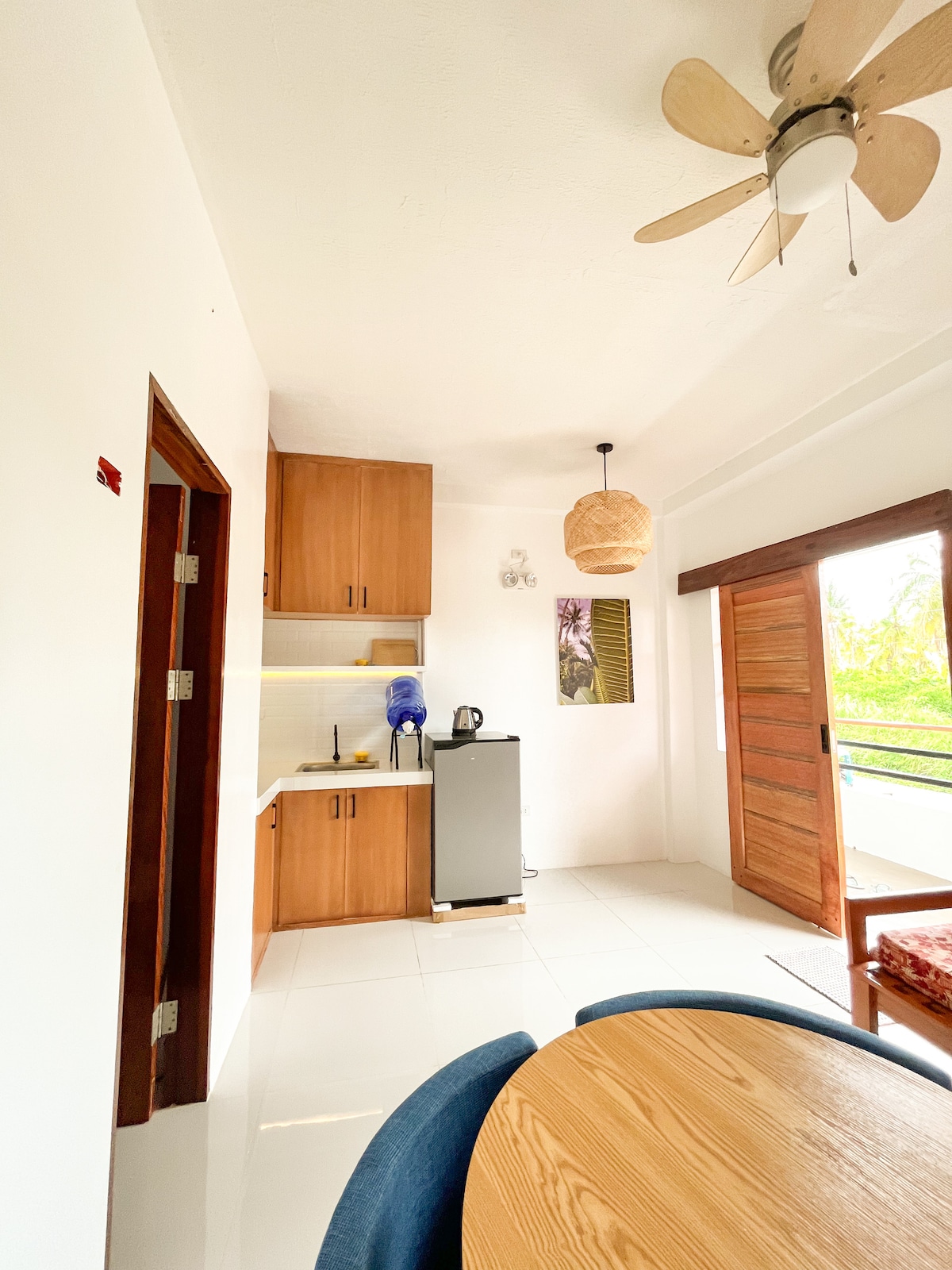 Nikmati keselesaan dan reka bentuk moden dengan sentuhan pulau di apartmen studio yang serba lengkap ini: -Split-jenis pendingin hawa - Katil queen size tebal - Dapur lengkap - Meja kerja -Starlink WiFi - Teres persendirian besar dengan meja makan - Bilik mandi persendirian dengan pancuran air panas - Penjana Sandaran - Akses ke taman tropika besar yang subur - Penginapan berpagar -Tempat letak kereta percuma atas permintaan -Malinao white sand beach at 5min walk - Kedai runcit kecil dalam jarak berjalan kaki - Restoran Carinderia dalam jarak berjalan kaki.