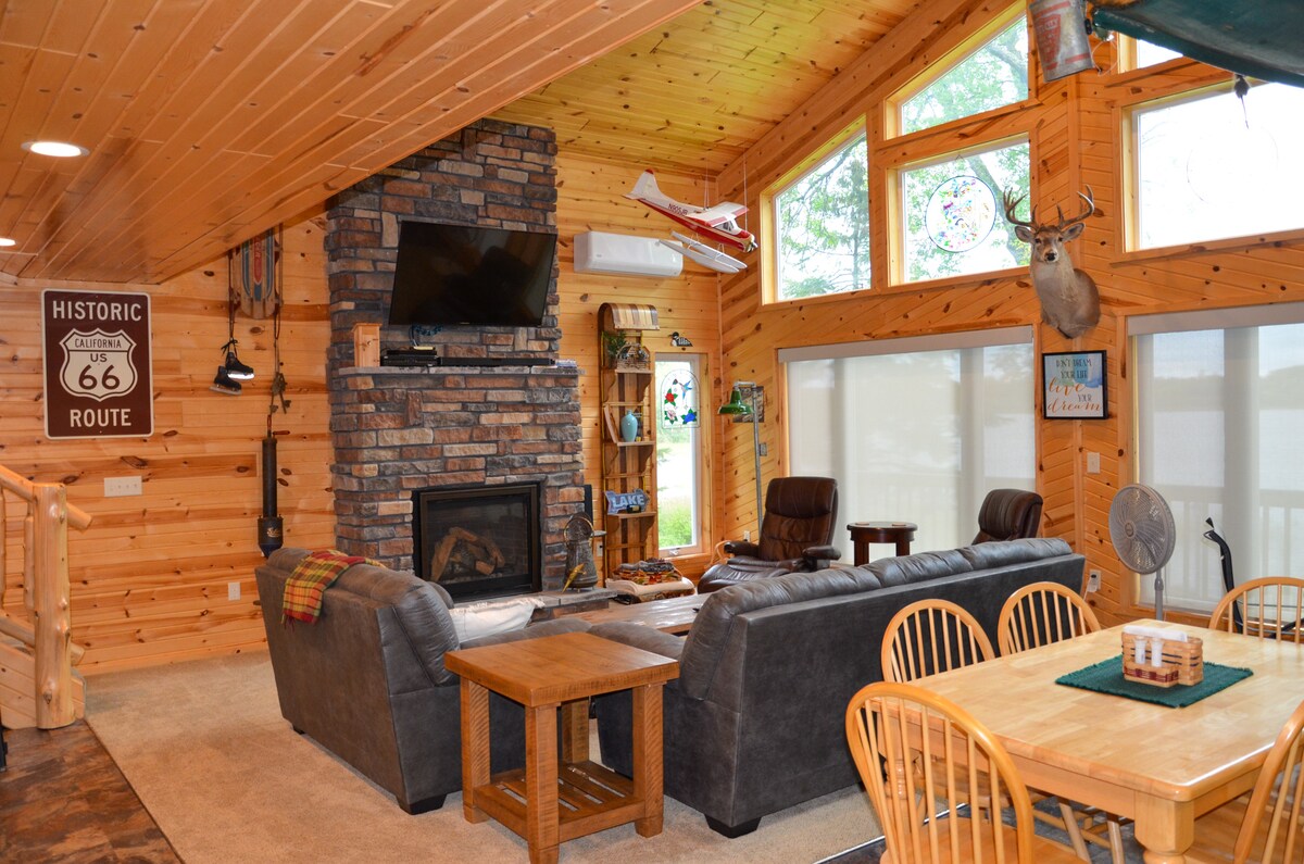 Percutian yang selesa & selesa di Northwoods of Minnesota menanti anda dan anda untuk ruang yang tenang untuk berehat dan menikmati ruang dalaman & luaran yang direka. Bandar luar bandar kecil dengan kemudahan mudah terletak setengah batu jauhnya atau bandar-bandar yang lebih besar hanya 20+ batu jauhnya dengan aktiviti luar. Jambatan setinggi 80 kaki kami ke pulau persendirian di kolam adalah suasana yang sesuai untuk membaca buku atau bermain kad dengan beberapa rakan. Bar ruang bawah tanah tersuai unik kami dan ruang intim di sekeliling akan memastikan anda berasa selesa.