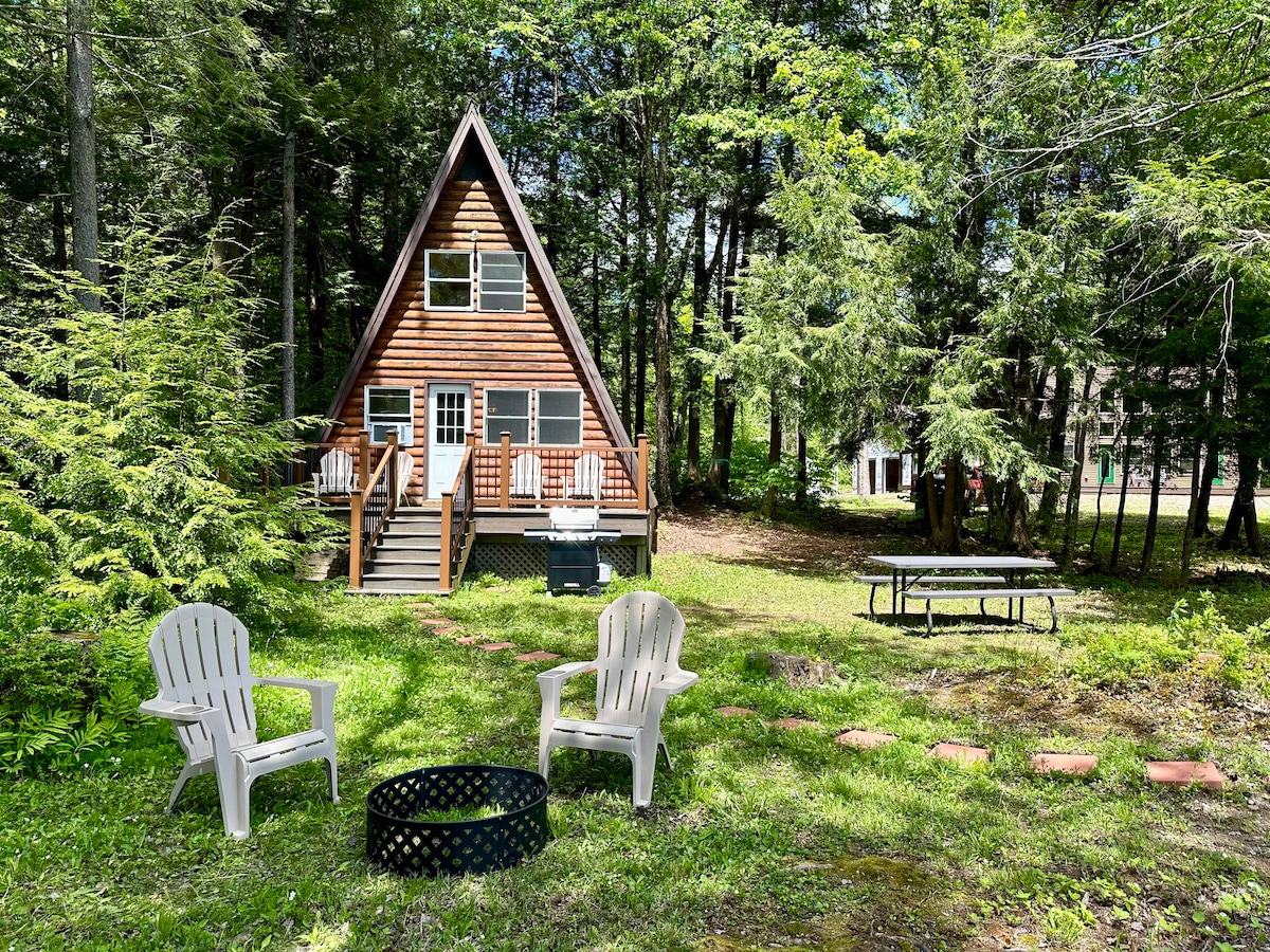 Enjoy the peacefulness of nature when you stay in this clean, modern A-frame that sleeps up to 6. Pet friendly and remodeled for the perfect romantic getaway or fun for the whole family! Offering 120 ft of safe lakefront access and views, one indoor and two outdoor fire pits and plenty of Adirondacks chairs for everyone. This A frame offers high speed Wi-Fi and streaming. 15 minutes from restaurants, Golf Course, Skiing, snowmobiling, hiking and biking trails, music festivals in summer.