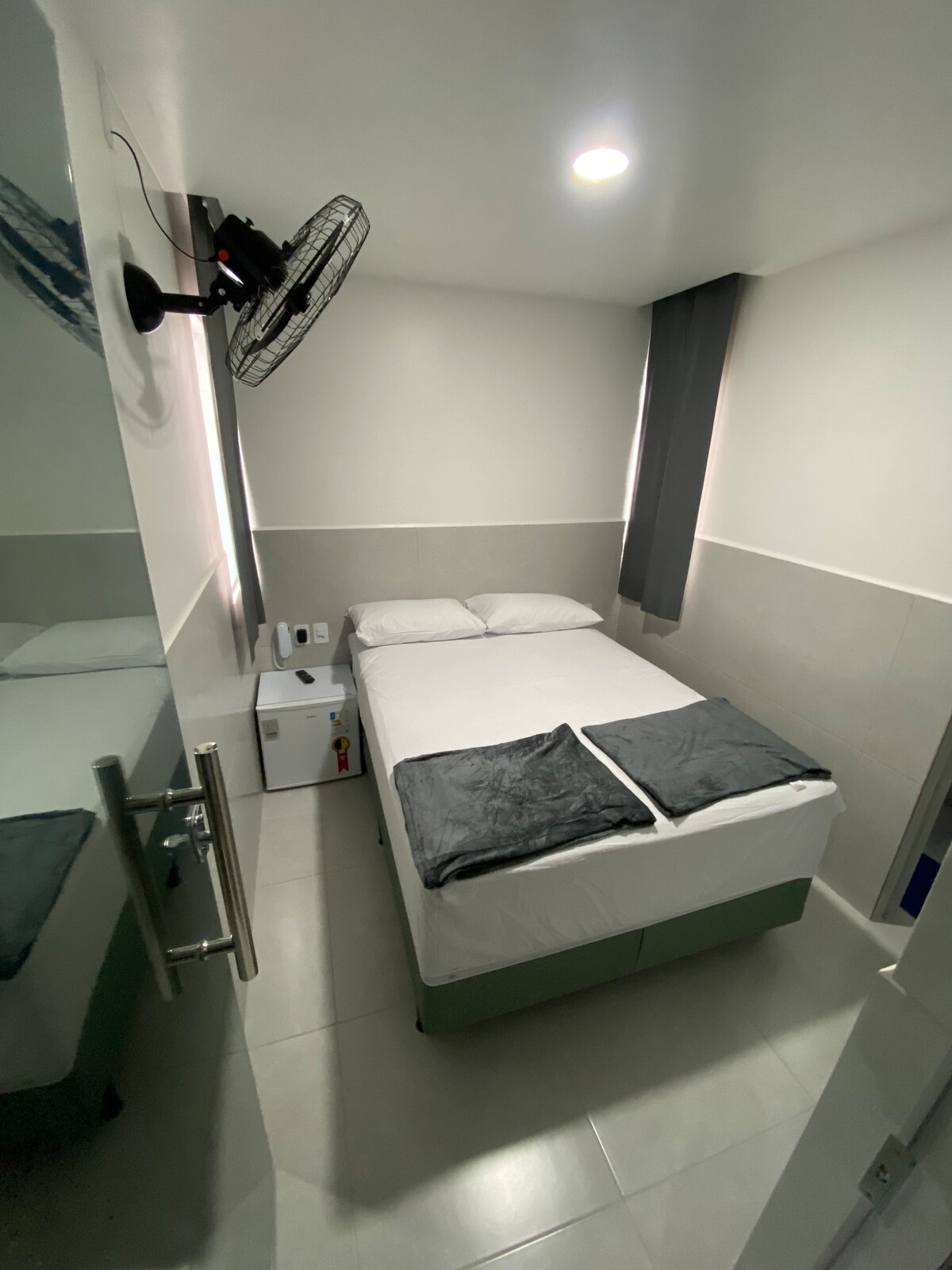 O quarto está equipado com uma smart TV, toalha, ventilador e frigobar.