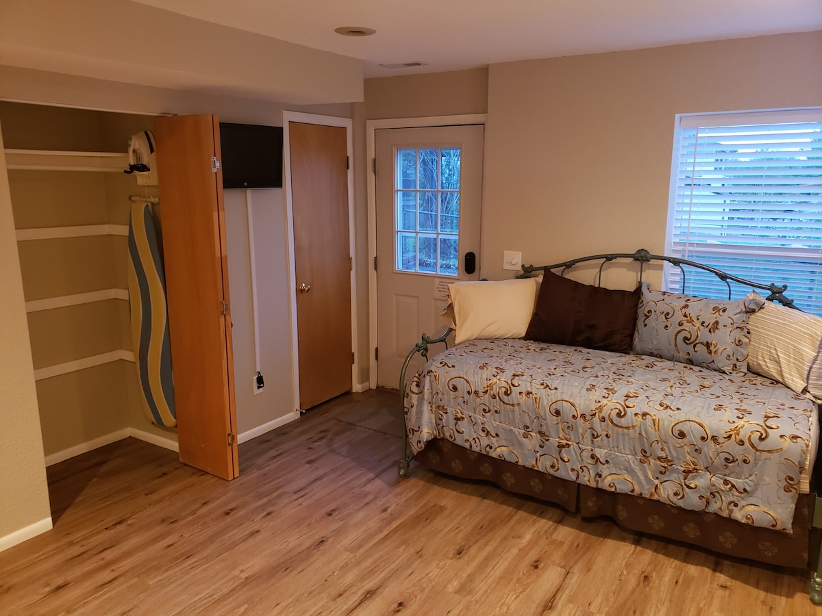Apartmen studio yang tenang, struktur berdiri sendiri di dalam hutan pain ponderosa yang indah. Apartmen yang tenang ini mempunyai katil bersaiz king, bilik mandi penuh dengan tab mandi, dapur kecil dengan pembuat kopi Keurig, ketuhar gelombang mikro, ketuhar pembakar roti, peti sejuk mini, sinki, pinggan mangkuk dll. Terdapat meja/ruang kerja khusus dan Wifi. TV, tempat duduk cinta dan meja kopi. Denai berjalan kaki kejiranan persendirian satu blok jauhnya yang menuju ke kolam. Tempat letak kereta percuma di tapak. Pintu masuk berkod. Disediakan kelengkapan dandanan diri dan snek. Dan pemandangan matahari terbenam.