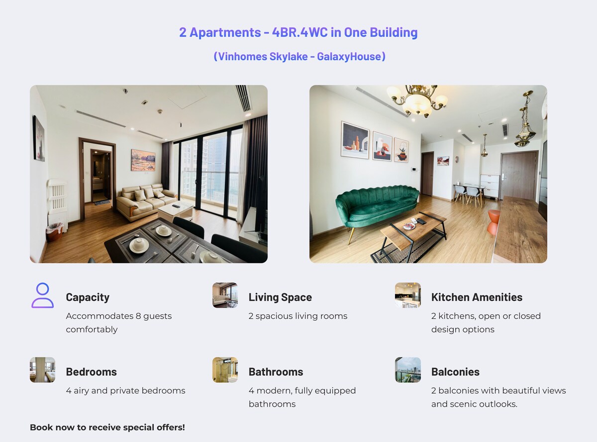 "VINHOMES SKYLAKE – SỐNG NHƯ MƠ, Ở NHƯ NHÀ" ✧ Không đơn thuần là nơi lưu trú – đây là không gian sống đẳng cấp, được vận hành chuẩn khách sạn 5 sao, lý tưởng cho những ai muốn vừa thư giãn, vừa cảm thấy như đang ở nhà. ✧ Căn hộ đầy đủ nội thất: giường lớn, bếp riêng, máy giặt, ban công thoáng. Không gian tiện nghi, sẵn sàng cho kỳ công tác hay nghỉ ngơi. ✧ Tất cả tiện ích đều nằm ngay dưới chân nhà – chỉ cần vài bước, bạn đã có thể đến Nhà hàng, quán cafe, gym, bể bơi, rạp phim,…