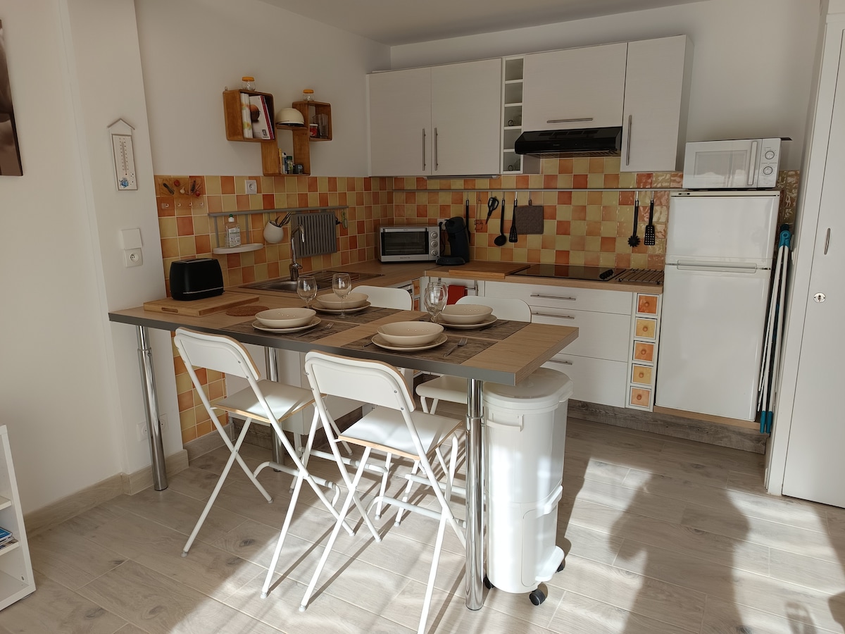Logement cosy et lumineux de 35 m² avec parking gratuit privé. Séjour composé d'un coin repas avec table 4/6 personnes et 2 lits superposés de 90 x 190. 1 chambre avec lit de 140 x 190 et grande armoire de rangement, 1 salle d'eau avec machine à laver, cuisine équipée et tous les équipements pour vous préparer des petits plats, balcon à vivre avec vue sur la végétation et la mer.