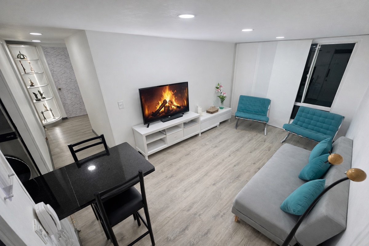 Suite apartmen dengan pencahayaan semula jadi, tingkat 5, satu bilik, dengan dapur terbuka dan lengkap, bilik mandi, katil kelamin, TV pintar, almari, meja, Internet gentian optik berkelajuan tinggi, berhampiran dengan restoran, bank dan jalan utama, Stesen Alcalá Transmilenio dan beberapa langkah dari taman yang indah, sesuai untuk berjalan-jalan dan bersantai di luar. Bangunan ini mempunyai pengawasan 24 jam, mempunyai lif, teres dan dobi umum