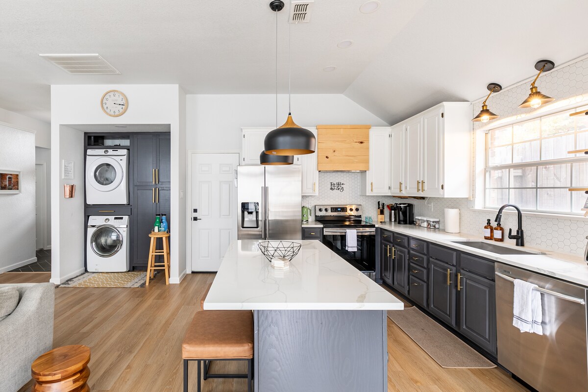 Tempat tinggal bandar dalam suasana subbandar menawarkan suasana santai untuk percutian yang sempurna. Rumah 3 BR 2 BA berperabot menarik ini kekal berjemur pada waktu siang, sambil menawarkan suasana romantik yang perlahan pada waktu malam yang ditetapkan dengan sempurna dengan pencahayaan yang boleh dimalapkan dan pendiangan duduk. Dapur besar dengan set makan dan banyak alat memasak. Meja makan besar yang juga boleh digunakan sebagai meja kerja. Bar kopi. Mesin basuh-pengering dengan detergen. Internet Cepat. Tempat Letak Kereta Garaj. Pack & Play dan Kerusi Tinggi.