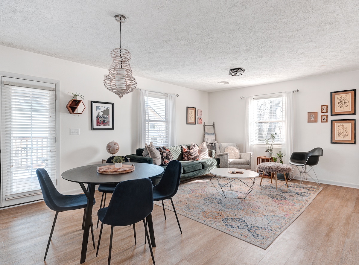 Rumah kereta kuda kami (dibina 2019) terletak di belakang rumah bersejarah kami di tepi timur Indianapolis. Kami memilih ruang ini dengan mengambil kira pengembara moden - daripada reka bentuk hingga kopi dan seni tempatan. Kami mahu penginapan anda memberikan anda keselesaan seperti di rumah sendiri sambil memberi inspirasi kepada anda oleh bandar yang kami suka! Ruang cerah dan moden di kejiranan pusat bandar yang berhampiran dengan semua yang ditawarkan oleh Indy! Berhampiran dengan Bottleworks, Mass Ave, dan kebanyakan lokasi pusat bandar. Kaedah pembersihan bekalan tanpa toksik. Kanak-kanak dialu-alukan!