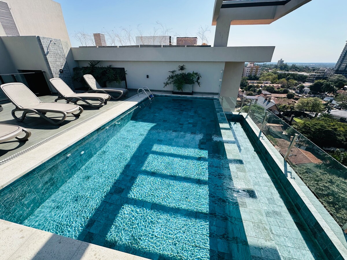Apartmen 1 bilik tidur di bangunan baru yang direka untuk penginapan jangka pendek. Terletak di kawasan utama Asunción, hanya 250m dari Shopping del Sol dan 600m Paseo La Galería. Ciri-cirinya termasuk kolam renang atas bumbung, gimnasium, bilik wayang, ruang kerja bersama dan zon BBQ. Termasuk balkoni dan meja hadapan 24/7.