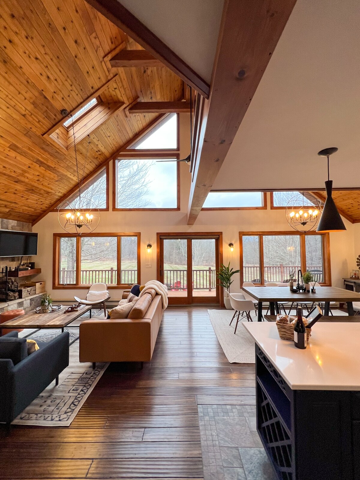 Ski at Windham Mountain Club and stay with us just 7 miles away at this modern 3-bedroom/4-bed/2-bath modern log chalet perched high along the northernmost edge of Mt. Pisgah offering panoramic views and 22 acres of seclusion completely surrounded by nature. Located close to hiking trails, rivers, lakes, reservoirs, breweries and wineries as well as Hunter (17 mi), Catskill (26 mi) and Hudson (30 mi), this is the ideal location from which to explore the best of the Catskills.