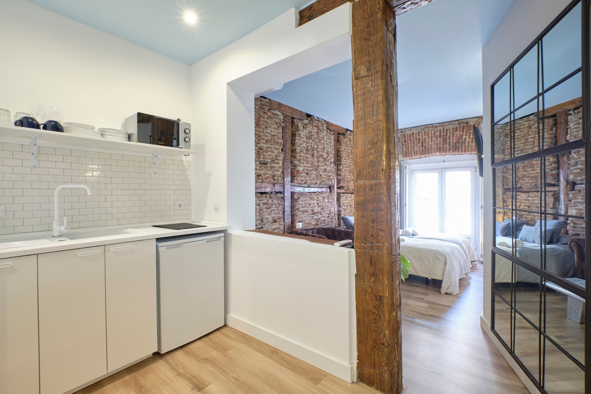 Bright and cozy at the very historical city center.Full equipped with Hi Speed Wifi, Air Conditioning, Central Heating, SmartTV, Fridge, Induction Kitchen, Hair Dryer, etc.Located at 100m from La Latina Metro StationYou will be at the very city center but you will not ear any noise, the studio is Brand new, built with best quality soundproof windows.Terraces, cafeterias, theatres, museums…all inside the neighborhood!