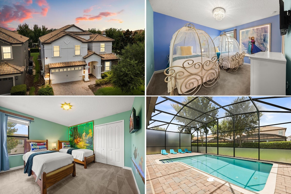 Stylish Design, Luxurious Comfort & Endless Entertainment, with a sprawling 2200 ft2 southwest facing pool deck & outdoor kitchen, no rear neighbors on a beautiful forest in the stunning 3.5 square mile Reunion Resort. You will have your own private pool with overflow spa, movie room, billiards - game room, 4 theme rooms: OUTER SPACE, MARVEL SUPERHEROES with a TUBE SLIDE, FROZEN II, HARRY POTTER CUPBOARD, PS5, within minutes to Disney.
