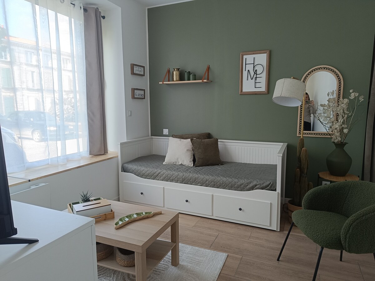MaranZen di tengah-tengah rawa Poitevin, 3 minit berjalan kaki dari pelabuhan,di tengah-tengah taman seluas lebih daripada 1.2 hektar di kediaman yang selamat dengan kolam renang + tempat letak kereta percuma, seluruh apartmen seluas 35 m² ini termasuk 4 katil dewasa, 1 bilik tidur,SBD, tab mandi, katil payung untuk bayi, tandas, ruang tamu,dapur +taman & teres persendirian. Sedia membantu anda:linen/wifi/mikro-O/TV+ /pembesar suaraBT/pengering rambut/seterika/pembakar roti/mesin basuh/peti sejuk,ketuhar,dll. Senyap, hutan. Sesuai untuk penginapan Zen.