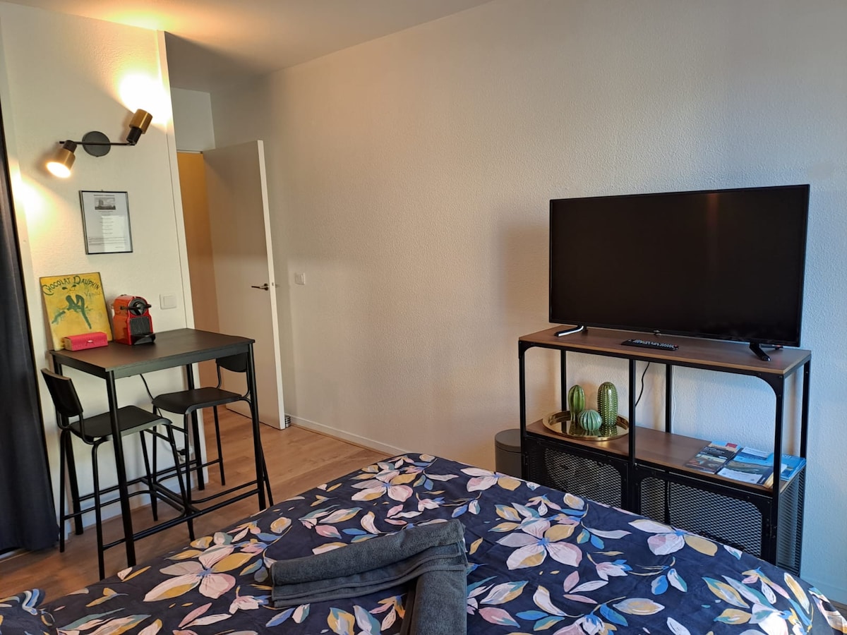 Studio seluas 20m2 bebas daripada rumah utama kami dengan akses kepada taman dan kolam renang (5mx3m) yang dikunci dan dipanaskan (Jun hingga September), ruang letak kereta percuma di jalan. Ia terdiri daripada: - katil 140 x 200 cm - bilik persalinan dengan penyangkut baju - Dapur serba lengkap: sinki, ketuhar gelombang mikro, hob, Dolce Gusto, pembakar roti, cerek, peti sejuk, pinggan mangkuk, ruang makan -TV dan Wi-Fi -bilik mandi dengan WC, pancuran mandi Itali - tuala/tandas, tuala teh, cadar -ventilator